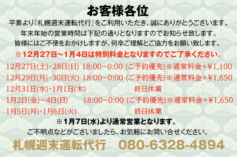 飲酒後や、運転ができない時は、「札幌週末運転代行」にお任せください!平日も営業しております。
